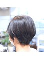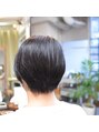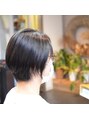 やや前下がりのショートスタイル。よりメリハリをつけるため、襟足は全体より1センチほど短くして引き締め感を出しています。襟足は軽さのある質感に仕上げてます。