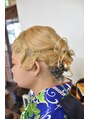 ミディアムのまとめ髪スタイルお顔まわりは流れのあるスタイルで、後ろは編み込みのシニヨンに黒のポイントの飾りで帯と同じ配色にしました!着付け担当→スタイリスト東