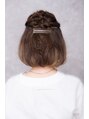 毛先をワンカール内巻きにコテで巻いて、こめかみの髪をねじりながら後ろでとめる。前髪はポンパドールにして毛束を崩してルーズさをだしたら、スプレーで固めます。