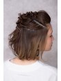 毛先をワンカール内巻きにコテで巻いて、こめかみの髪をねじりながら後ろでとめる。前髪はポンパドールにして毛束を崩してルーズさをだしたら、スプレーで固めます。