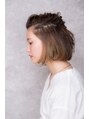 毛先をワンカール内巻きにコテで巻いて、こめかみの髪をねじりながら後ろでとめる。前髪はポンパドールにして毛束を崩してルーズさをだしたら、スプレーで固めます。