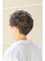 ツーブロックのパーマスタイル。サイドは刈り上げて襟足は少し長さを残して刈り上げ。前髪はかきあげるようにリバースでパーマをかけて、スタイイングで外ハネに仕上げます。爽やかなメンズスタイルです。