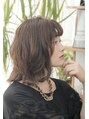 肩につく長さのミディアムスタイル。パーマで髪全体に柔らかいクセをだして外ハネに♪バームなどで質感をだして仕上げると◎