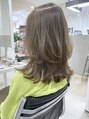 鎖骨ラインの位置でカットしやわらかい動きの毛束感を出すためにレイヤーを入れコテ巻きするとやわらかいスタイルになります。カラーは赤味をしっかり消しオリーブベージュにしました。ブックマークをクリックしカウンセリング時にご利用ください。
