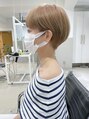 前髪はワイドな前髪で襟足は少し刈り上げサイドは耳したギリギリでカットし丸みが出るように軽さの入れ方を工夫しました。カラーは赤味を消すようブリーチしオンカラーでピンクベージュにしました。ブックマークをクリックしカウンセリング時にご利用ください