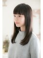 重めに作った前髪で目力を強調させるスタイル。顔周りを包み込むレイヤーはシャープですっきりとした印象に。カラーは暗めのソフトグレージュ