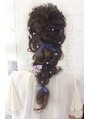 手作りのヘアアクセサリーをご持参のお客様。波ウェーブでアイロンをかけて、トップをくるりんぱし、サイドは細かい編み込み。下の毛束を二つに分けて三つ編みを2つ作り、それをねじってあわせてヘアアクセサリーをつけて完成!