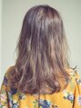 キュートなイメージをなくさないように重ためのバングにし、フォルムは丸みを出し柔らかくしました。カラーも暖色にすることによりスタイルとの相性バッチリ♪ゆるいウェーブにより動きと抜け感があるので今旬の愛されスタイルにしました。