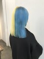 ブリーチ2回以上でつくるハイトーンカラー。今回はスカイブルーとレモンイエローのツートーンカラーに!インパクトのあるカラーもお任せください◎