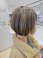 ハイライトをしっかり入れて、平面的に見えるショートボブに動きと立体感を♪通常のカラー、カットにブリーチによるハイライトとオンカラー。髪質改善縮毛矯正/髪質改善トリートメント/白髪ぼかしハイライト/ブリーチ[桶川]