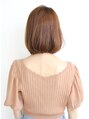 カットは首回りをスッキリさせたボブスタイル。肩につかないつかない長さ設定なのでハネにくく乾かしただけで簡単にまとまるので朝時間がない方にもオススメです!前髪は丸顔や大人っぽく見せたい方に似合うかきあげバングです!ワンカールパーマもオススメ
