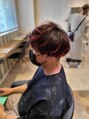 以前入れて抜けたハイライト部分にレッドカラーをのせて、マッシュのラインでバランスよくアシンメトリーにして遊び心あるスタイルに。パーマはポイントでブリーチしてあるのでダメージを最小限に!!