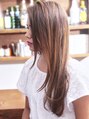 前上がりベースのロングレイヤースタイル!! 動きをつけるために、部分的にハイライトを入れてあります!! あまりそぎ過ぎないようにし髪の毛のツヤを大切にしています!! かき上げバングでセクシーな印象に仕上がっています!