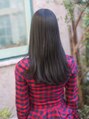 Aラインのストレートロング。ぱっつりとカットした切りっぱなし風の毛先がポイント。前がみの幅を目尻ぎりぎりで狭めにとることでクールな印象に。いつものストレートに飽きた方にもおすすめなノームコアロング☆前がみの似合わせOK 【大島】
