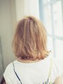 くせ毛のような質感でくしゃくしゃふわふわ~崩しすぎずてないのがポイントです。 前髪をすこしかき上げて大人らしさもプラス。 カラーはハイトーンカラーで透明感をだしました。 秋もハイトーンカラーでエアリー感があるスタイルがおすすめです。
