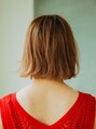 肩上レングスのカジュアルな切りっぱなし外はねボブ スタイル。バングは眉下の長さで、巻いて眉の長さになるようにしました。カラーリングはベージュ系でハイライトを全体に入れて動き、立体感の出るようにしました。[大島/大島駅]