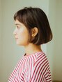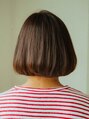 少し前下がりで丸いシルエットのアゴ下ボブ。毛先に重さを残してカットしているのでバングは短めで束感を出して重たくなりすぎないようにバランスを取っています。カラーリングは赤みのないナチュラルなブラウンカラー。[大島/大島駅]