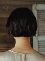 センターパートの大人ショートボブスタイルです。襟足はギリギリの長さでスッキリさせます。カラーリングはレットブラウンでツヤ感を出します。毛先に動きを出すように大きめにゆるく巻きます。スタイリングも艶が出るオイルで仕上げます。[大島/大島駅]