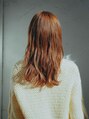 毛先重めのロングレイヤースタイル。長めのバングはセンターでわけて大きく隙間ができるようにカットしてナチュラルな雰囲気をつくりました。カラーリングはオレンジ系の暖色にして肌がきれいに見えるように仕上げました。[大島/大島駅]