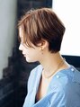 流しセンターパートのハンサムショートボブスタイル。毛先にカールがあるのでカッコすぎず可愛らしさもあるヘアスタイルになっています!前髪伸ばしたいけれど顔にかかるのは嫌という方におすすめのスタイルになっています。[大島/大島駅]