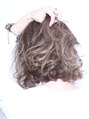 表面にしっかりと陰影がつくようにバレイヤージュを入れ、その後全体を彩度低めのグレージュカラーでオン。アッシュ系の色になりがちなハイトーンをベージュベースで日本人の肌にも合いやすい色味で仕上げました☆ウェーブ状に巻いたらグロスでスタイリング☆