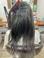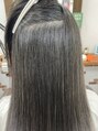 見た目は簡単に伸びそうな毛質。他でかけたらすぐクセが戻ったそう。ハーブカラーをしていたり、見た目よりクセが伸びづらく薬剤をしっかり効かせるために時間をおける薬剤スペックでじっくり伸ばしました