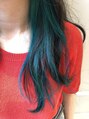 インナーにブリーチ1回でエメラルドブルーを入れました!!1回でもこの発色に!!ブルー系のカラーはオレンジ味を抑えながら退色していくので、色落ちもかなりオシャレでかわいいです!!
