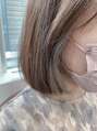 ブリーチ2回以上で作るホワイトグレージュ。抜け具合によってブリーチ回数は変わっていきます。ボブとイヤリングカラーの相性はとってもよくて耳にかけたらチラリと見えるように、表面もほんのり明るめで馴染みの良いカラーの組み合わせにしています。