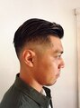 グラデーションでの刈り上げをし右サイドは2ブロックにします。トップは長めに設定し、刈り上げとのメリハリをつけます。