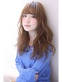 流しバングで小顔ウエーブなセミロング♪低温デジタルパーマで大きくゆるくウエーブを作り、流し前髪を作ることで小顔効果抜群!カラーはヘルシーヘーゼルで透明感UPと赤みの少ない外国人のような髪色に♪