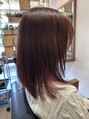 カットは顔まわりにレイヤーを入れて小顔効果を。カラーはサイドの内側のみブリーチ。その後ピンク系の色味を。全体にはレッドブラウンで落ち着いた印象に。