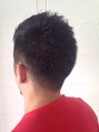 サイドはバリカン5ミリ、トップは長めのソフトモヒカン、サイドの短さとトップの長さの違いでワイルドなスタイルに。ネープは季節や生活シーンに合わせて長さ調整、今回は刈り上げてサッパリと。