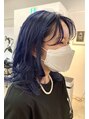 全体的にブリーチで明るくトーンアップしてからしっかりめのネイビーブルーをオンカラー。伸ばしかけの前髪は根本を立ち上げてセンター分けにしてふんわりと見えるように。