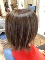 前回のハイライトが残ってたので、12レベルのマットアッシュをオン。白髪も少しあり。カットは少しずつ段を取っていって毛先はセニング25ミリのコテで外はね。
