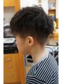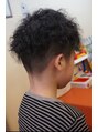サイド~バックにかけて3mmでツーブロックに刈上げ、全体に膨らまないよう毛量調整を行います。細めのロットでスパイラルパーマをかけます。