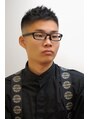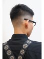 チョッとの遊びとフェードを入れた個性派スタイル。サイド~バックはバリカン0.1ミリ~9ミリのバリカンでぼかしながらグラデーションを付けます。トップは中間から毛先にかけて均等に削ぎを入れます