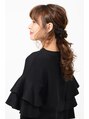 カンタン&ゴージャスに見えるローポニーアレンジ。くるくるとねじったサイドの毛を、低めに作ったポニーテールにまとめ、トレンドの三角バレッタをアクセントにつけます。毛先と後れ毛の強めカールが可愛さのポイント。