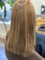 ベースは一度ケアブリーチでハイトーンにしてから上からミルクティーベージュを入れて仕上げました。ダメージをなるべく抑えて艶感のある仕上がりにしました。