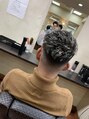横後ろはフェードカットで、両サイドに剃り込みでラインを一本ずつ。ツイストパーマで無造作に波打ちに。ハイライトも多めに入れて、束感や立体感が出やすくしました。