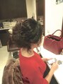 お姫様スタイルが大好きなお客様。フロントからサイドにかけてツイストを合わせてフィッシュボーンぽく、なんちゃって編込みを作りました。トップはふんわり盛って、手櫛サイズのスジで動きをだして、バックにボリュームたっぷりのカールをチラしました。