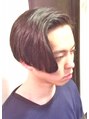 前下がり・重めのボブベース。サイドのツーブロックはのばしかけなのでスッキリまとめて脱ツーブロ狙いです♪襟足は刈り上げてスッキリと。モードな雰囲気です。