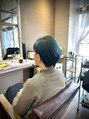 赤みを抑えた深みのあるブルーカラーで、落ち着きと透明感を両立した大人ショート。後頭部に自然な丸みを出し、首元はタイトに。顔まわりも骨格に合わせて丁寧に似合わせ、伸びても扱いやすいスタイルです。