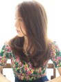 ナチュラルでいてセクシーなカールにくぎづけ!! 鎖骨下15センチのローレイヤー。 スライドカットでしっかり毛量&質感調節をします。赤味の無い外国人カラーです。大きいカールが重なってほつれた感じのウェーブに。