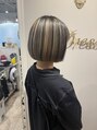 ミニボブアンブレラカラー全体ブリーチ後、ブリーチ部分はミルクティー系に。表面はフェイクブラックでアンブレラカラーに、白っぽいシルバーみたいな黒色がオシャレ。普通の黒染めと違い後に残らない為、退色後キレイなブリーチ毛へ戻ります。