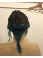 カット。。。ミディアムレイヤーでインナーカラーが見えるように レイヤーの位置を考えました。。。カラー。。。横から襟足の内側をブリーチで一回色を抜きます。 シャンプーしてから表面はブルーアッシュ9レベル、内側は青です。。。