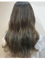 あえて根元はブルーアッシュで暗くしているのでハイライトとのメリハリが効いてて良いですね☆山中美智子さんなんかもしているカラーなので、これからの季節等にオススメです☆