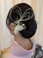 艶感を活かしたタイトシニヨンに、金箔と水引、白花を合わせた上品な成人式ヘア。すっきりとしたシルエットが振袖の柄や帯を引き立て、後ろ姿まで美しく写真映え◎落ち着いた大人の雰囲気がお好みの方におすすめです。