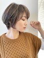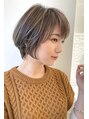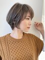 ひし形シルエットの大人かわいいハンサムショートボブ。艶カラーの大人ボブ。前髪はセンターパートで小顔に。透け感をプラス。はちうえの量が膨らまない様に量を間引いて骨格に合わせた似合わせカット。簡単スタイリングヘア。艶カラー、ハイトーンカラー