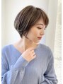 ひし形シルエットの大人かわいいハンサムショートボブ。艶カラーの大人ボブ。前髪はセンターパートで小顔に。抜け感をプラス。はちうえの量が膨らまない様に量を間引いて骨格に合わせた似合わせカット。簡単スタイリングヘア。艶カラー、オリーブアッシュ