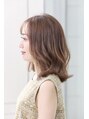 華やかなミディアムスタイル。ベースを外ハネにする事で、抜け感が出てバランスが良いアイラインシルエットになります。カラーは明るめのヌードベージュ。アレンジしてもかわいい顔まわりのカットにこだわりあり。